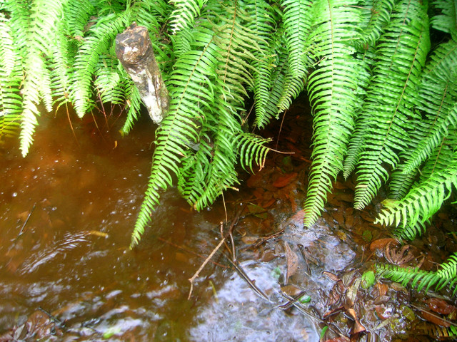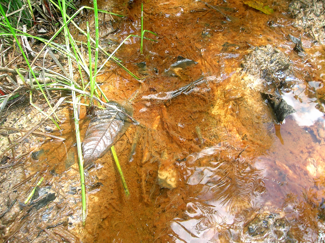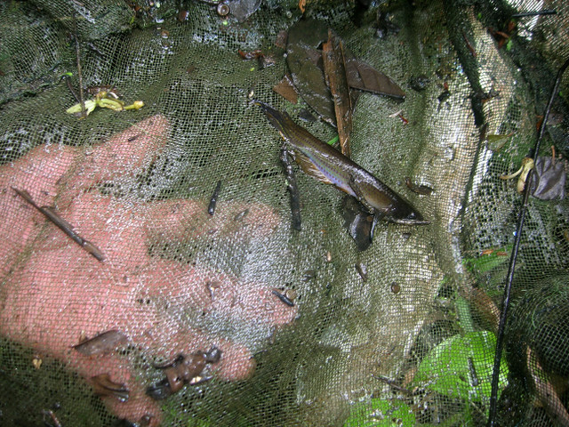 El lugar era fantástico, como una quebrada y helecho a sus lados fantásticos y lo curioso es que el agua era totalmente roja, primero intentamos pescarlos donde había un poco mas de agua y no salía nada, así que los buscamos donde ya casi no existía agua y ahí estaban escondidos entre las hojas secas, que con las justas entraba la red por la poca cantidad de agua.