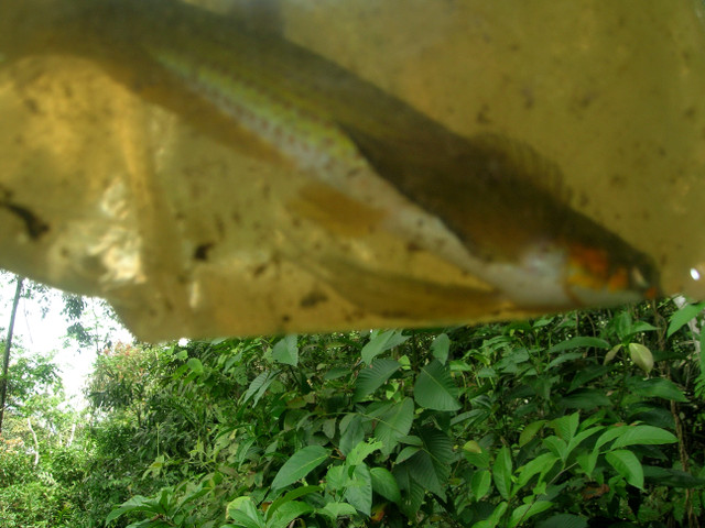 Una de las sorpresas que nos dimos en esta caminata fue con el rivulus speciosus, que solo se atrapo uno solo en una charca muy pequeñita, que casi ni la probamos y el chino me comento que no había ni uno solo mas a pesar de mi persistencia insistimos con unas 10 tiradas y nada, solo se encontró uno y era precioso.