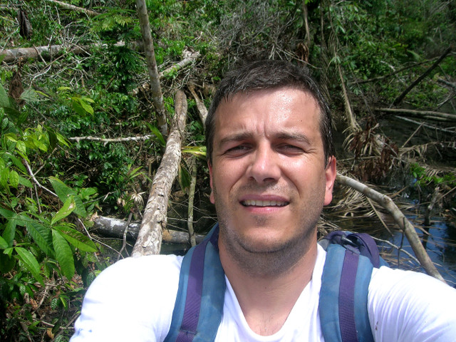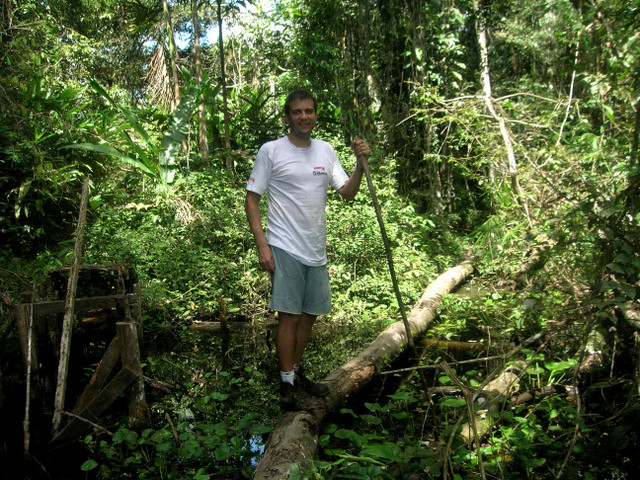 Claro que el chino paso haciendo equilibrio solo con uno de los troncos y habían dos paralelos como la línea de un tren, así que me asegure de poner un pie en cada lado, arrastrando los pies, la verdad que esos 5 mts de altura intimidaba la caída y pensar de caer al lodo, con la posibilidad de no poder salir, era muy, pero muy intimidante, el problema fue cuando los árboles se comenzaban a abrir y mis piernas también, hasta que no pude abrir mas, ni caminar para adelante , ni para atrás, cuando se escucho el grito de tarzan, Chino ayúdame, que hago, se me comenzaron a acalambrar las piernas por la tención y no se de donde apareció el chino con una liana que me sirvió de soporte para jalarme y quedarme en un tronco y poder atravesar el maldito río, cuando el chino me dice, estuviste cerca, tendremos que buscar otro regreso y yo le dije al chino, prefiero caminar tres horas mas buscando otro camino, que tener que regresar otra vez a lo mismo y eso que tuve mis épocas de Alpinista.