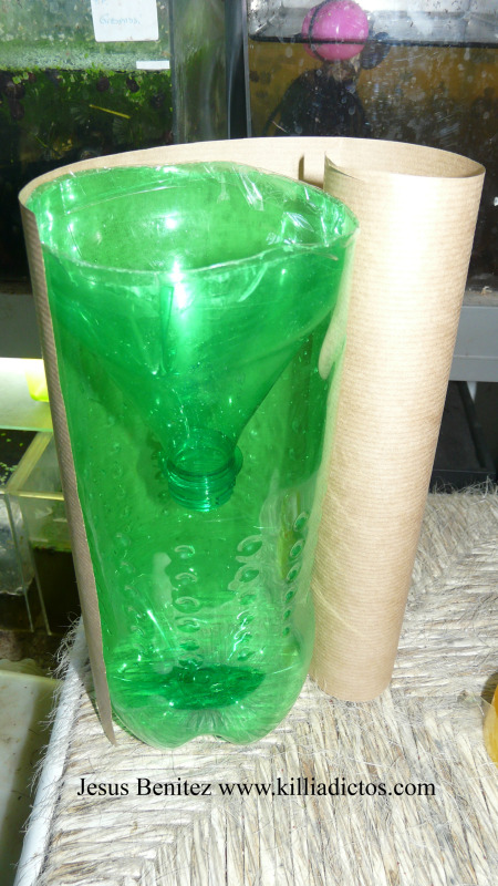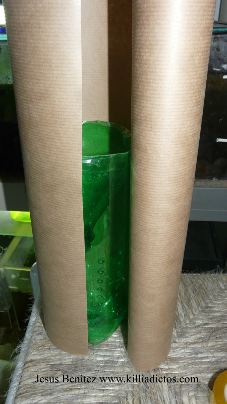 Pegamos con la cinta adhesiva o celo por el lateral de forma que el interior de la botella no reciba luz por ningún lado que no sea la parte superior.