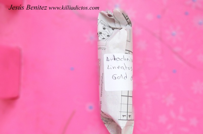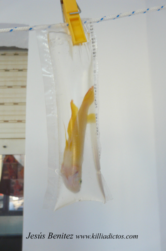• aquí tenemos al killi en este caso un Aplocheilus Lineatus Gold en la bolsa pulmón previamente cortada como se detalla en el artículo correspondiente.