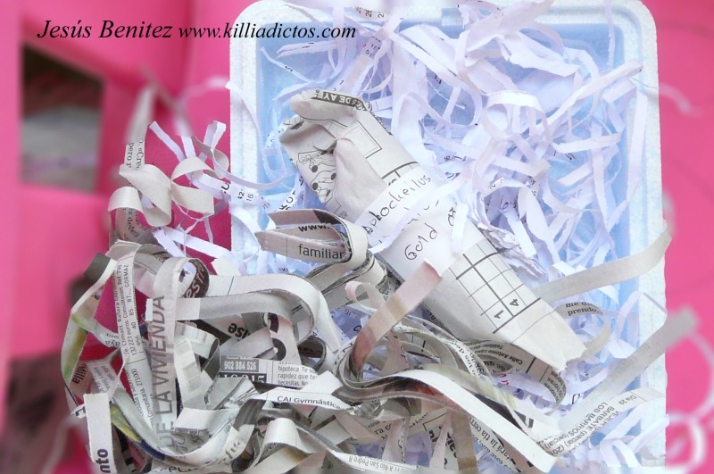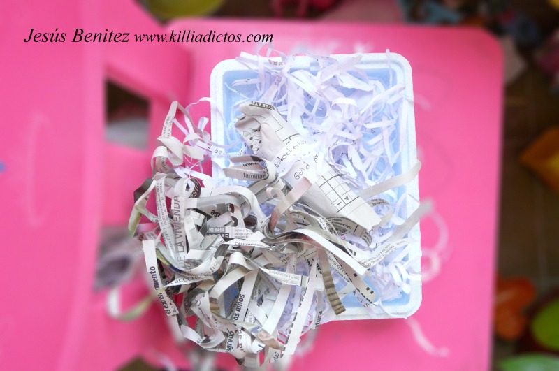 Ahora toca preparar el envio, cogemos la caja y le colocamos fideos de papel, los podemos hacer con un triturador de papel o con una tigera.