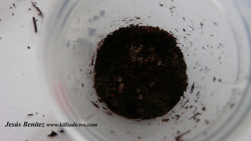 Coloco una pequeña capa de turba en el fondo del frasco y le coloco sobre ella unos cuantos huevos como se puede ver en la fotografía.