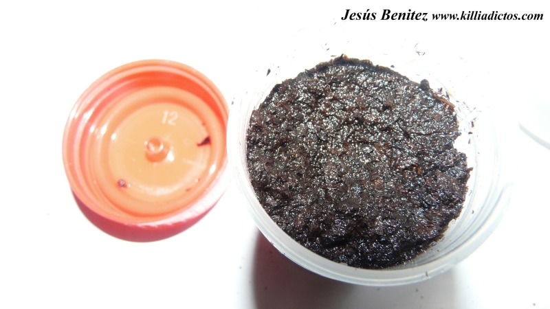 Ahora echaremos agua de la que colocamos en los acuarios para killis sobre la turba hasta que esta quede chorreante, no ahogada, si es necesario presionamos la turba con el recipiente bocabajo para que elimine el exceso de agua.