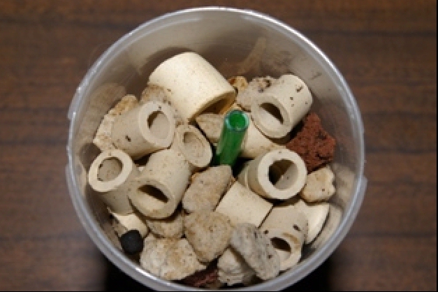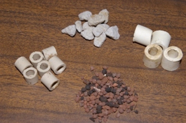 Diferentes tipos de material filtrante biológico: cilindros de cerámica, zeolitas, gránulos de lava. Sobre estos sustratos anidan las bacterias nitrificantes. También se pueden añadir gránulos de turba (los de color negro) para acidificar ligeramente el agua.