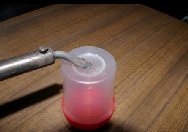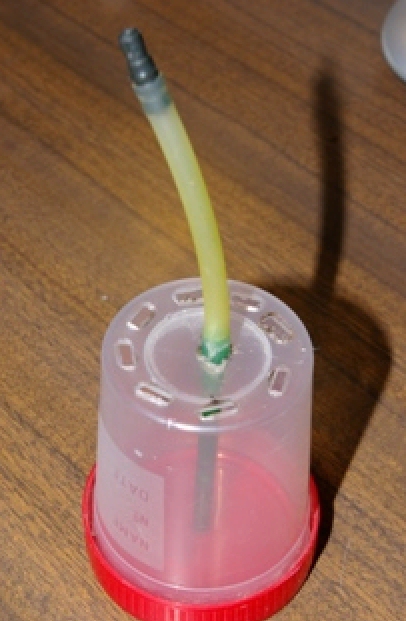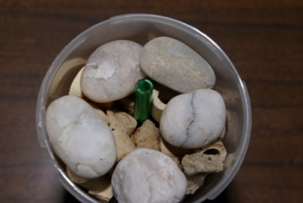 Sirve cualquier recipiente de plástico con tapa, en mi caso utilizo estos botes de muestras de agua potable, que reciclo de un laboratorio. Su volumen es de 100 ml y los suelo poner en acuarios de hasta 10 litros (la mayoría de los que tengo son como estos.)