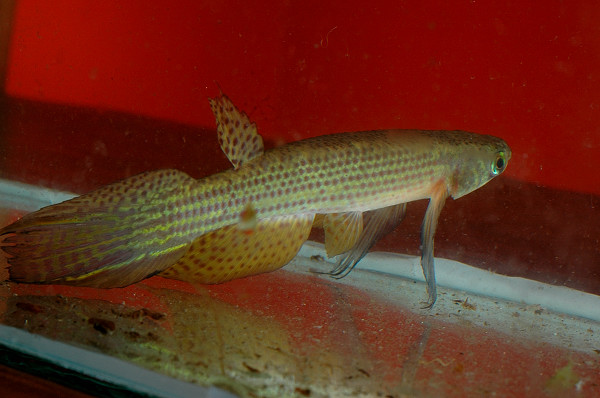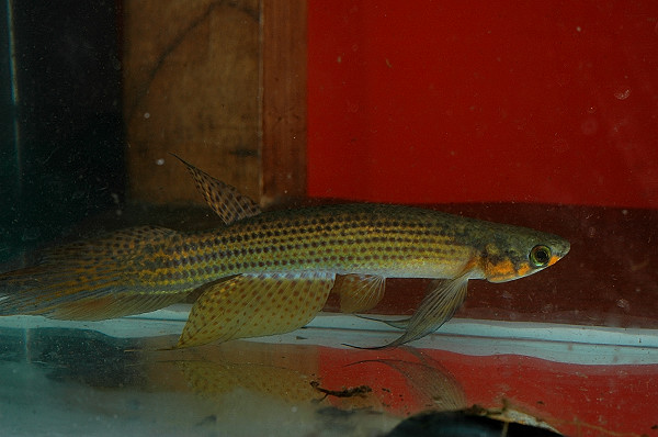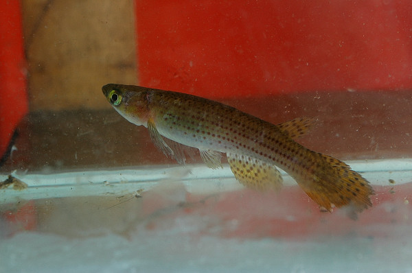 Los machos tienen un margen negro exterior en toda la aleta caudal. El cuerpo cuenta con 6 - 7 líneas horizontales de puntos a partir de las agallas a la base de la aleta caudal: las líneas son alternativamente rojo y naranja.