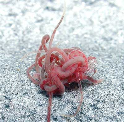 Al mantenerlos en agua corriente, tienen un comportamiento similar, sólo que al no poder enterrarse se aprietan unos a otros formando una "pelota" dura que sólo se afloja agitándola en el agua. En el núcleo de esa masa apretada, el oxígeno no llega de modo que de no moverse en forma constante los individuos que están en el centro morirían asfixiados.